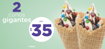 Válido del 1 de mayo al 31 de julio de 2017. Presenta este cupón en Spyral y obtén 2 conos gigantes por $35. No aplica con otras promociones. No aplica con ingredientes extras. Aplica únicamente en todos los negocios de Spyral de la República Mexicana. Sujeto a disponibilidad del producto. Promoción válida sólo una vez, contra entrega de cupón.